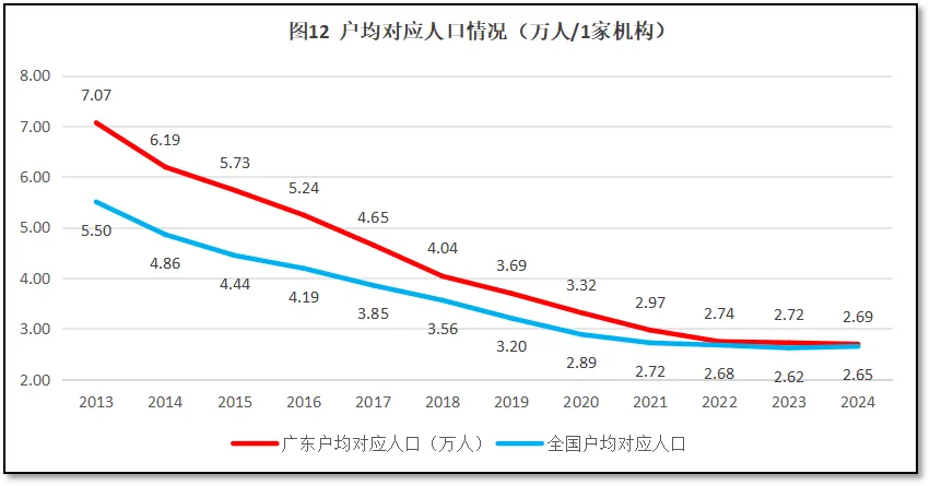 再来看广东地区检验检测机构户均对应服务的人口数据。2024年末,广东省常住人口1.278亿人,检验检测机构户均服务人口2.69万人,与全国平均数2.65万人进一步接近。过去12年,广东省检验检测机构户均对应的人口数量与全国的情况进行比较,如图12所示。