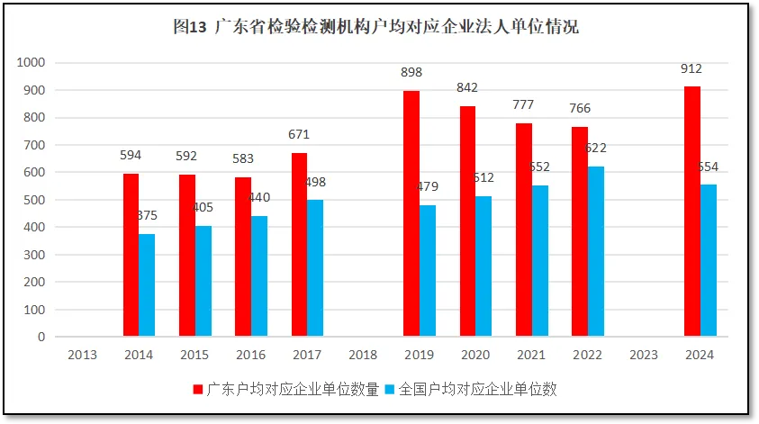 广东作为经济大省,企业单位数量众多,以2023年度的统计数据计[ 国家统计局在2025年公布了第五次全国经济普查的数据,其中包含2023年末各省企业法人单位数量的数据。],广东地区企业单位数量超过432万个,位居全国第一。广东省检验检测机构户均对应的企业法人单位数量为912个,比全国平均水平554个高出358个,排名全国第4,较2023年增长了三位。这一数据表明广东地区检验检测机构的市场空间更大,可拓展的客户资源更多;同时也说明广东地区企业法人单位可获得检验检测服务方面比其他地区可能要差一些。过去12年广东地区检验检测机构户均对应企业法人单位数量与全国情况的比较如图13所示[ 国家统计局未公布2013、2018、2023年度的企业法人单位统计数据。