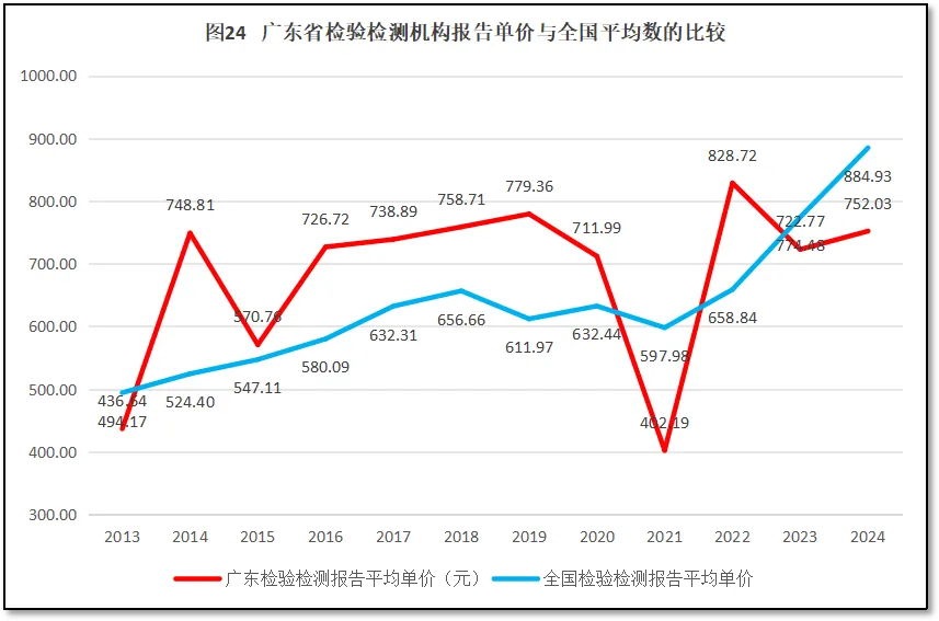 由图24可见,全国检验检测机构出具的检验检测报告单价总体保持较为平稳的增长,但广东省检验检测机构出具的检验检测报告单价在总体保持增长的同时存在几次大幅度的波动,最近几年在全国平均线附近波动,2023、2024连续两年已经低于全国平均水平,排名全国第23位,再一次下降。可以看到,由于广东省检验检测机构数量多,竞争激烈,市场成熟,价格透明度很高,且低价竞争现象较为普遍,导致检验检测报告单价居于全国中等偏下水平。