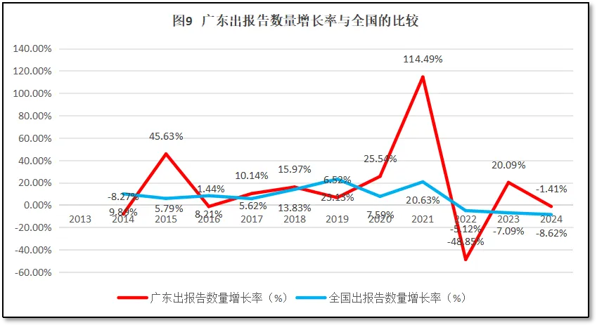 广东省检验检测机构出具报告数量的增长率与全国的比较如图9所示。