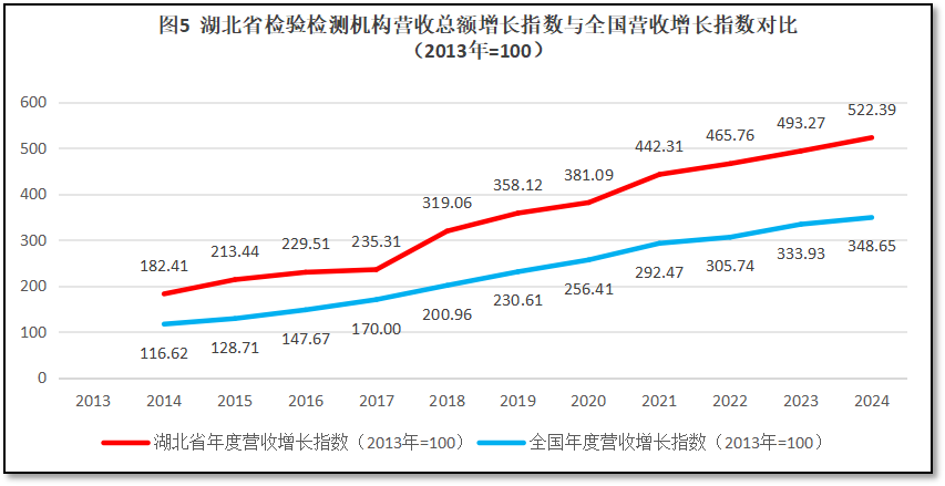 由上图可见,湖北省检验检测机构营收总额增长指数一直保持着高于全国平均数的水平发展,曲线始终高于全国平均线,最近几年还有与全国指数逐步拉大差距的趋势,到2024年增长指数相差173左右,这说明湖北省检验检测行业发展比较稳健,营收增长维持在较为理想的状态中。