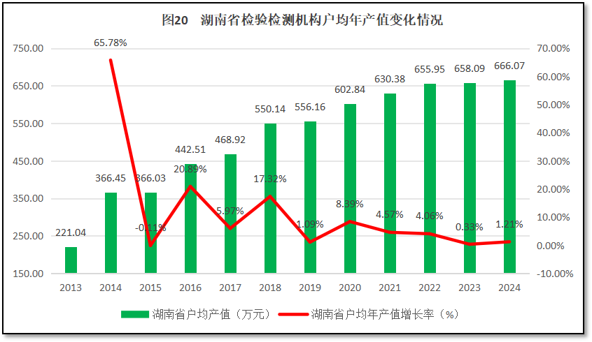 由图20可见,总体来看,湖南省检验检测机构户均年产值持续保持增长,仅在2015年出现过一次轻微下跌。2024年湖南省检验检测机构户均年产值为666.1万元,是2013年的3.01倍。从增长率的曲线来看,除了头两年数据误差大显得增长率很高之外,湖南省检验检测机构户均年产值的同比增幅总体平稳,近11年的平均增长率为6.37%,在2016年和2018年出现过两次相对高一些的增长峰值,增幅分别为20.89%和17.32%。最近几年增幅逐步降低,2024年的同比增幅仅有1.21%。