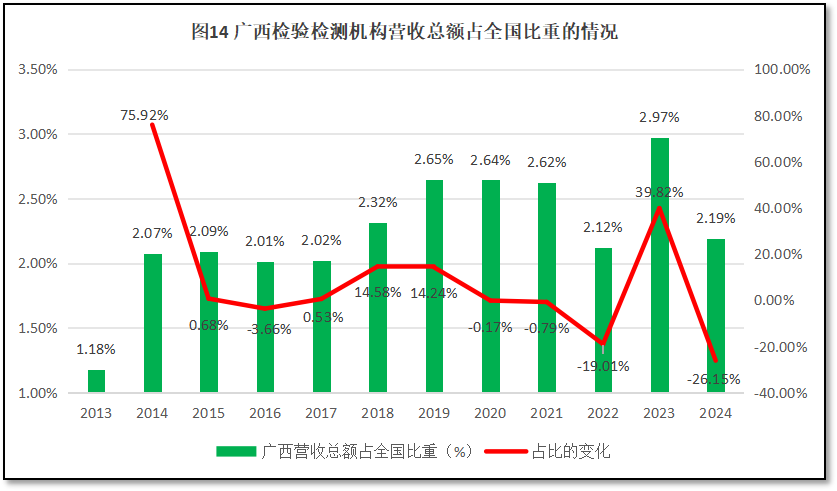 2024年度,广西壮族自治区检验检测机构营收总额为106.91亿元,占全国检验检测行业年度营业收入的2.19%,在全国检验检测行业中排名第18位,较2023年度排名下降了8位,可谓断崖式下降。过去12年广西壮族自治区检验检测行业年度营业收入总额在全行业中的占比情况如图14所示。