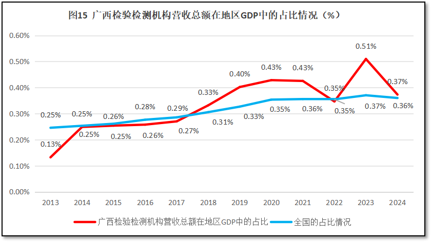 从图15可见,总体来看,广西壮族自治区检验检测机构营收总额在当地GDP中的占比逐年增长,并在2018年之后超过全国平均数。虽然2022年一度下降到与全国平均数持平,但2023年广西的数据又大幅提升,远超全国平均数。2024年广西的曲线出现下跌,但仍微弱领先于全国平均数。这说明广西壮族自治区检验检测行业的发展虽然还有不稳定性,但其在广西壮族自治区经济版图中的地位不断提升,其创造的直接价值和间接价值都不断增大。