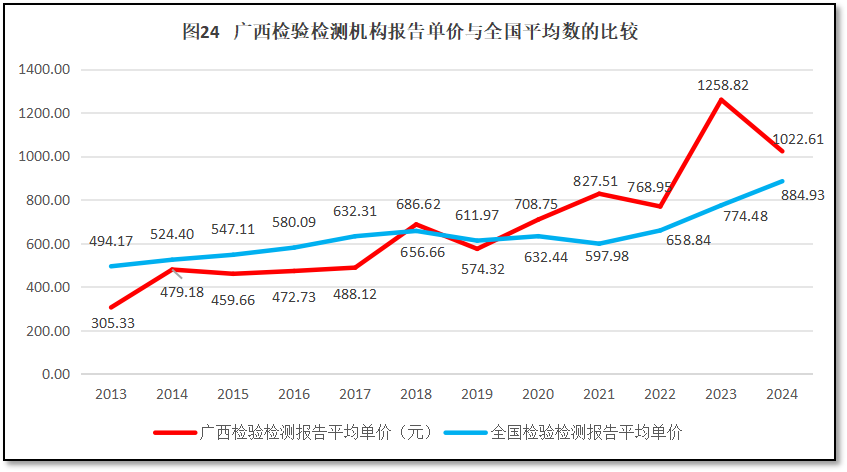 由图24可见,广西壮族自治区检验检测报告的单价总体逐步增大,并在2018年左右接近并在2020年之后就高于全国平均水平,近几年虽然波动幅度大,但一直保持在全国曲线之上。2024年广西壮族自治区的报告单价数值有所下降,比全国平均数高出137元左右。总体来说,广西壮族自治区检验检测报告单价逐步走高,有利于广西壮族自治区检验检测机构扩大利润空间,提升发展质量。