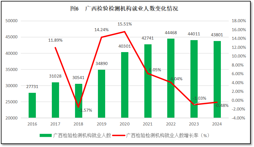 由图6可见,2022年之前,广西壮族自治区检验检测机构从业人员数量总体来说保持增长,从2016年的2.77万人增长到2022年的4.45万人左右,但最近两年就业人数微弱下降,2024年末就业人数下降到4.38万人。从增长率曲线看,除了因为2017年数据偏差导致数据起伏较大之外,2019年和2020年广西壮族自治区检验检测机构从业人数有两个较高的增幅,此后增长率逐年下降,到2023年之后连续两年增长率均为负值,2024年度的增长率为-0.48%。
