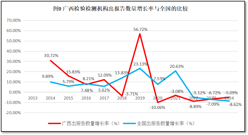 广西壮族自治区检验检测机构出具报告数量的增长率与全国检验检测机构出具报告增长率的比较如图9所示。
