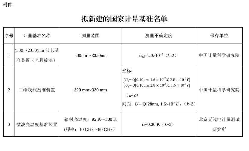 为加强计量体系和能力建设,市场监管总局拟批准新建“(500~2350)nm波长基准装置(光频梳法)”“二维线纹基准装置”“微波亮温度基准装置”等3项国家计量基准,现予以公示(具体内容见附件)。公示截止日期为2024年12月13日。